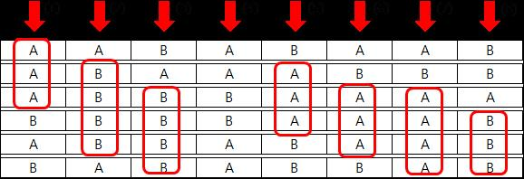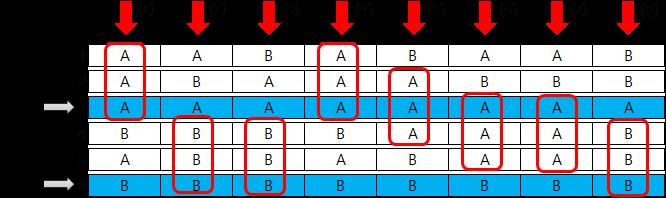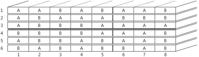 [Fig. 2]는 셀 8개로 이루어진 엷은 막 6장을 쌓아서 만든 두께 6, 가로크기 8인 보호 필름의 단면이다. A, B는 각 셀들이 가진 특성 A, 특성 B를 의미한다.