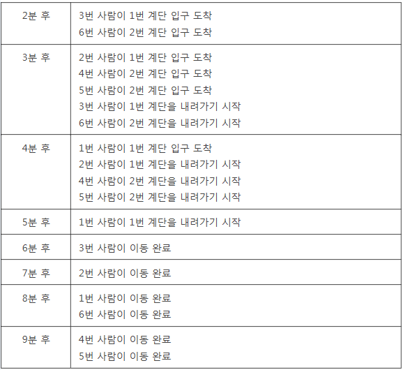 이 경우, 모든 사람이 계단을 내려가 이동 완료하는 최소 시간은 9분이다.