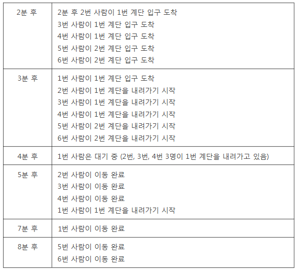 이 경우, 모든 사람이 계단을 내려가 이동 완료하는 최소 시간은 8분이다.