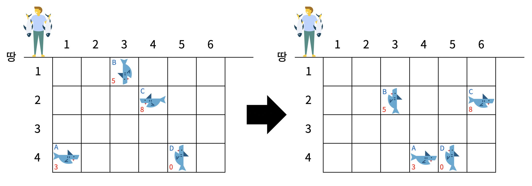 - 낚시왕이 오른쪽으로 한 칸 이동한다.