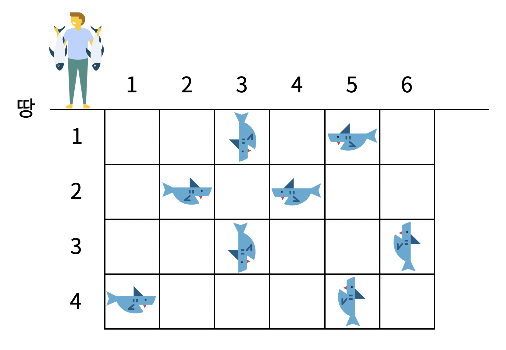 - 낚시왕이 있는 열에 있는 상어 중에서 땅과 제일 가까운 상어를 잡는다. 상어를 잡으면 격자판에서 잡은 상어가 사라진다.